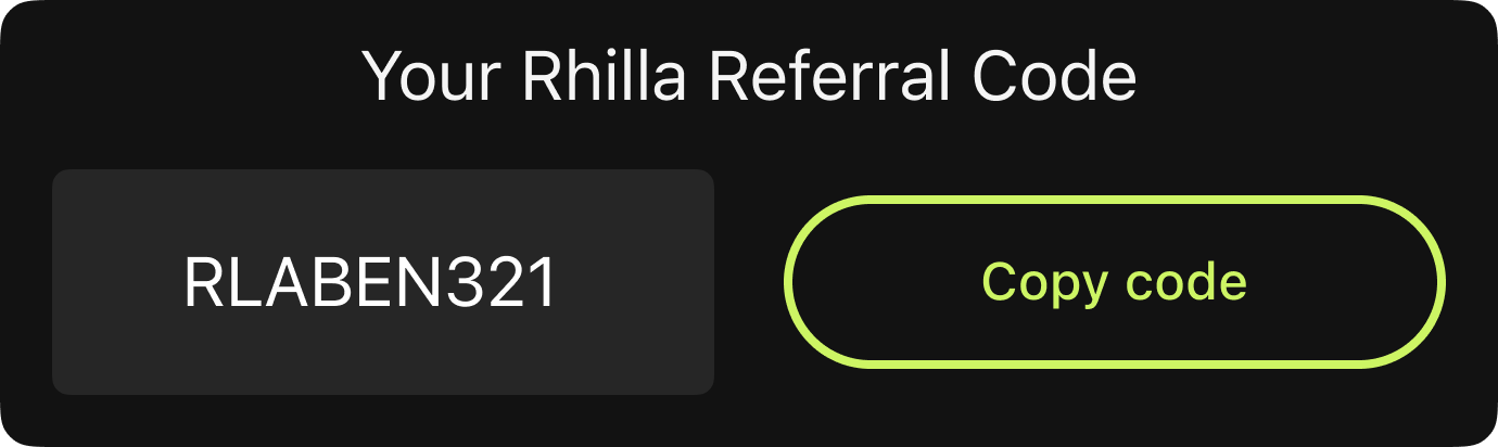 Invite your friends to join the fun. Share your referral code and earn Rhilla points when they sign up. Plus, you’ll receive 10% of all the Rhilla points they earn, forever!